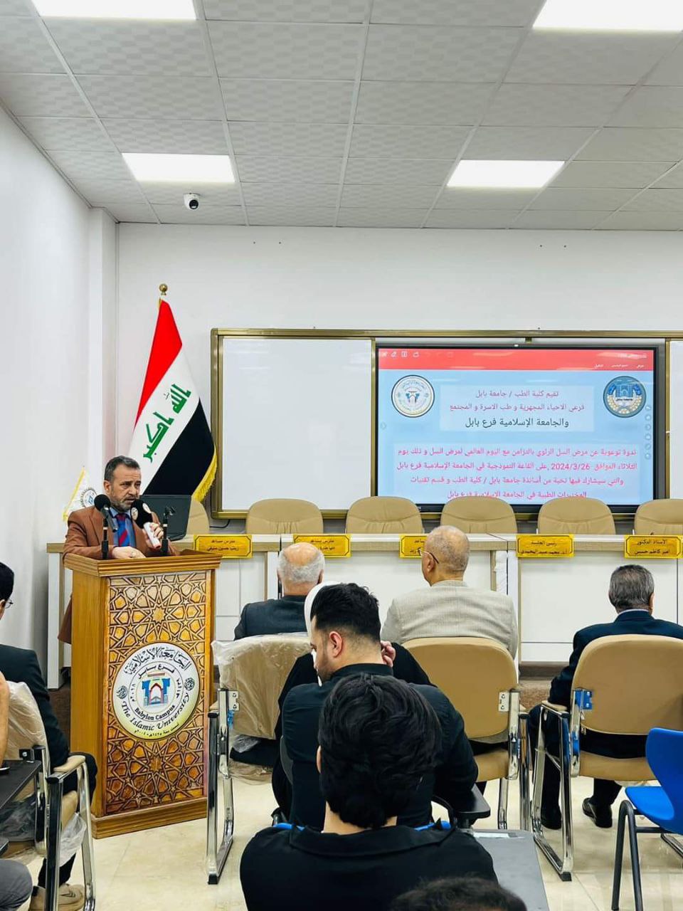 إقامت الجامعة الإسلامية فرع بابل (قسم تقنيات المختبرات الطبية ) وبالتعاون مع كلية الطب في جامعة بابل (فرع الأحياء المجهرية وفرع طب المجتمع) الندوة العلمية التوعوية لمرض (السل الرئوي) وبرعاية الأستاذ الدكتور حيدر القريشي رئيس فرع الجامعة الأسلامية في بابل.