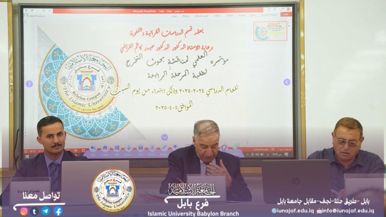 في اجواء اكاديمية علمية متميزة وبأشراف مباشر من قبل رئيس الجامعة الإسلامية فرع بابل الأستاذ الدكتور( حيدر القريشي ) شرع قسم الدراسات القرآنية واللغوية مناقشة بحوث التخرج لطلبة المرحلة الرابعة