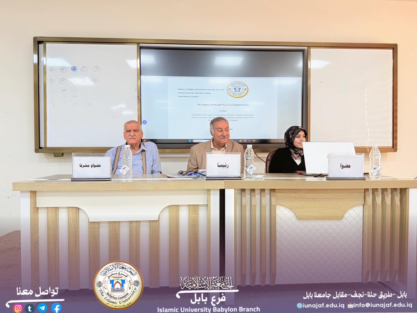 في اجواء اكاديمية علمية متميزة وبأشراف مباشر من قبل رئيس الجامعة الإسلامية فرع بابل الأستاذ الدكتور( حيدر القريشي ) باشر قسم اللغة الإنگليزية مناقشة بحوث التخرج لطلبة المرحلة الرابعة