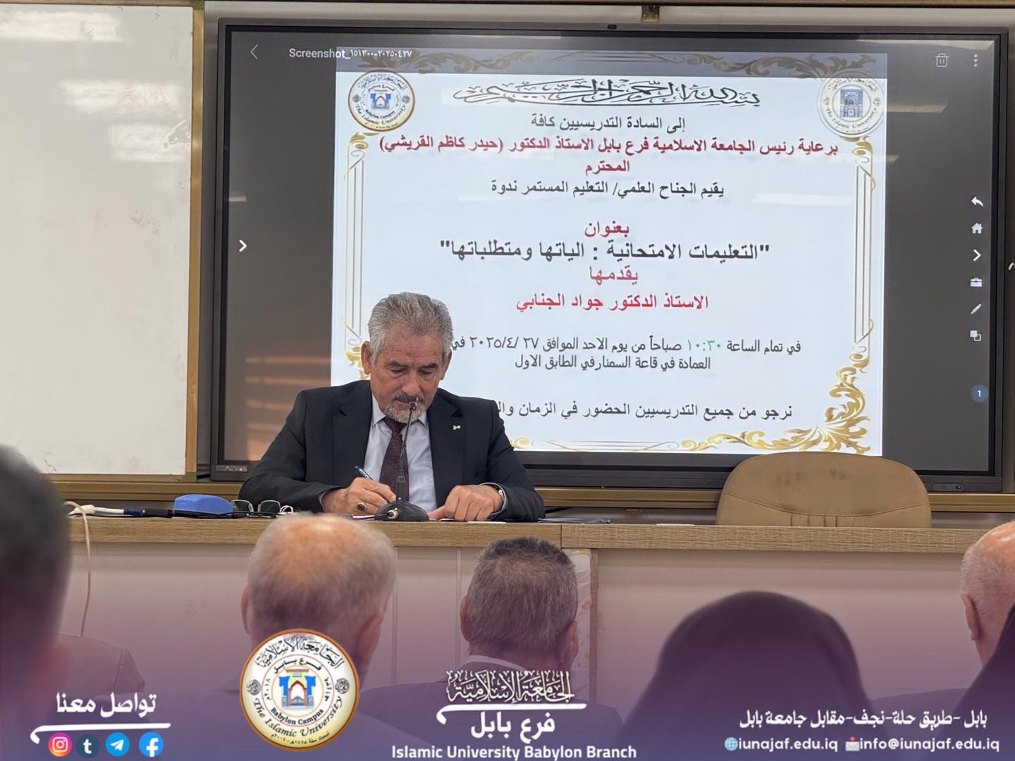 تحدث الأستاذ الدكتور جواد الجنابي في الندوة، حيث سلّط الضوء على أهمية الامتحانات كأداة لتقييم فهم الطلبة وتحفيزهم على التعلم، بالإضافة إلى دورها في تحديد المسارات الأكاديمية والمهنية وتقييم فعالية المناهج الدراسية. تناولت الندوة محاور متعددة، منها مستلزمات اللجان الامتحانية، تعليمات وضع الأسئلة، تهيئة القاعات، تعليمات الطلبة والمراقبين.. شهدت الندوة حضورًا واسعًا من الكوادر التدريسية، الذين اكدوا على أهمية الالتزام بالتعليمات لضمان سير العملية الامتحانية بسلاسة وشفافية. تأتي هذه الندوة ضمن سلسلة من الفعاليات التي تنظمها الجامعة لتعزيز الوعي بالإجراءات الامتحانية وتحسين جودة التعليم.